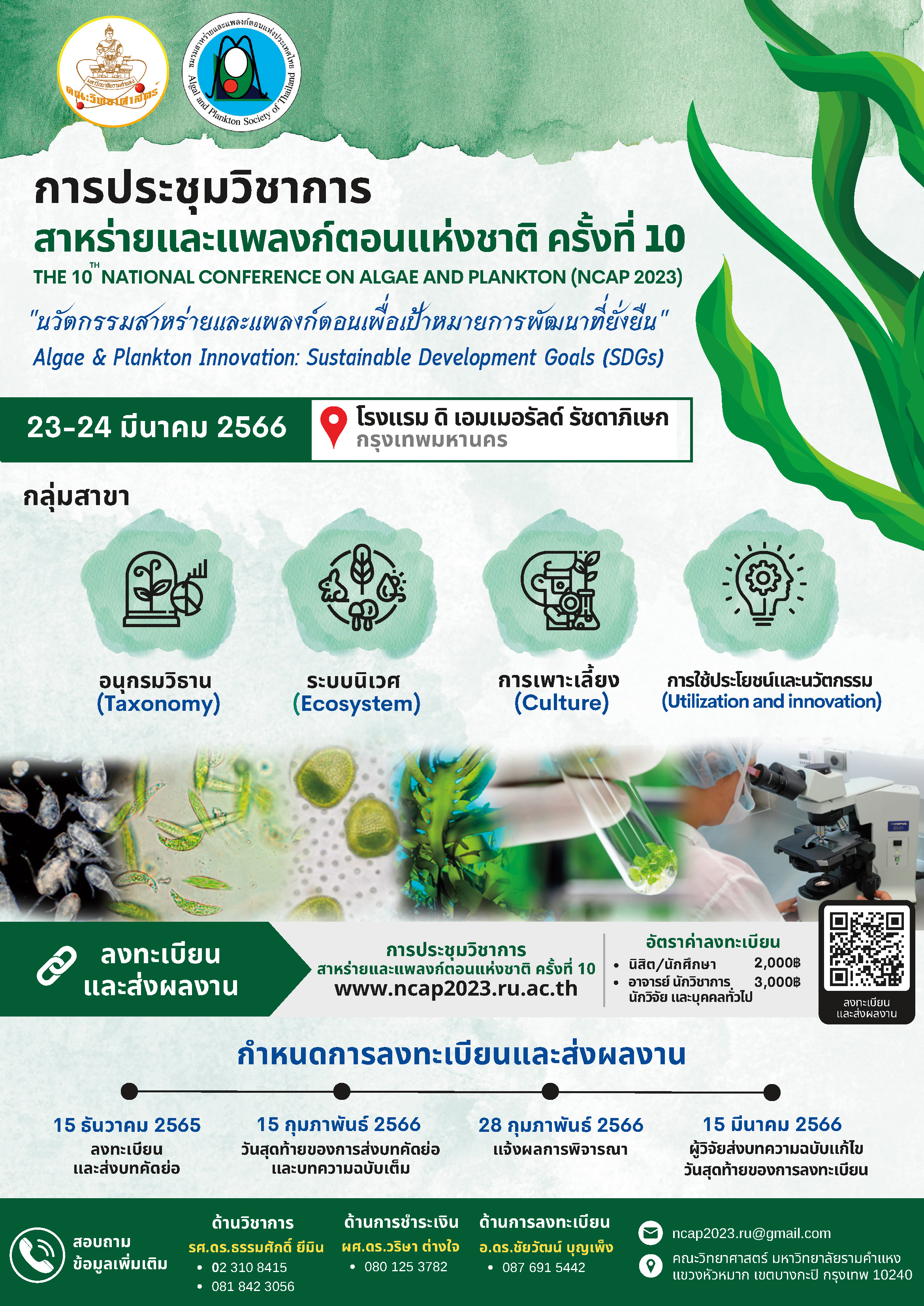 | 6 | โครงการประชุมวิชาการสาหร่ายและแพลงก์ตอนแห่งชาติ ครั้งที่ 10 | Click | 13 ก.พ. 2566 12:41:10 | 280 | 2 เม.ย. 2569 18:03:56 | |
